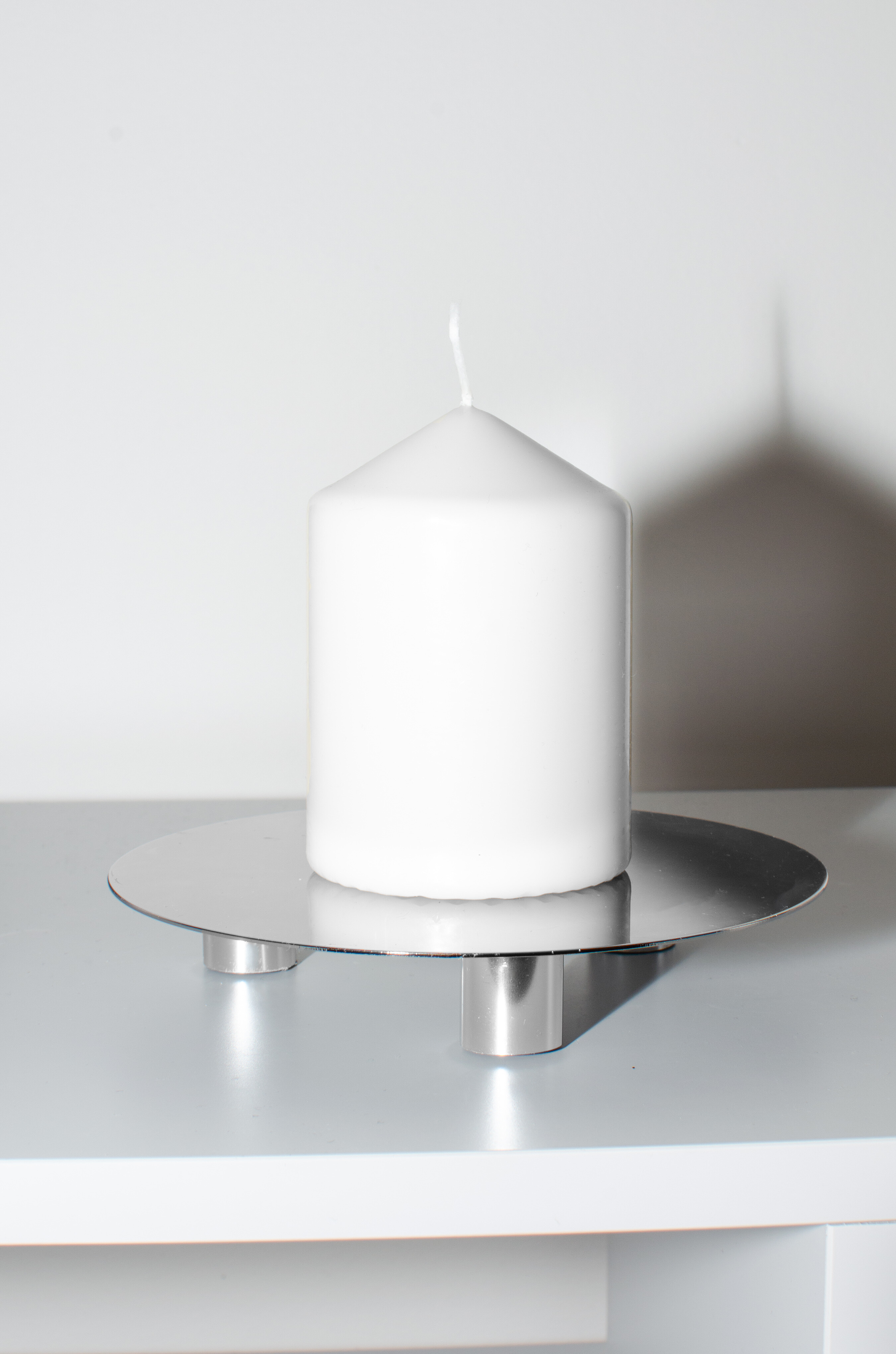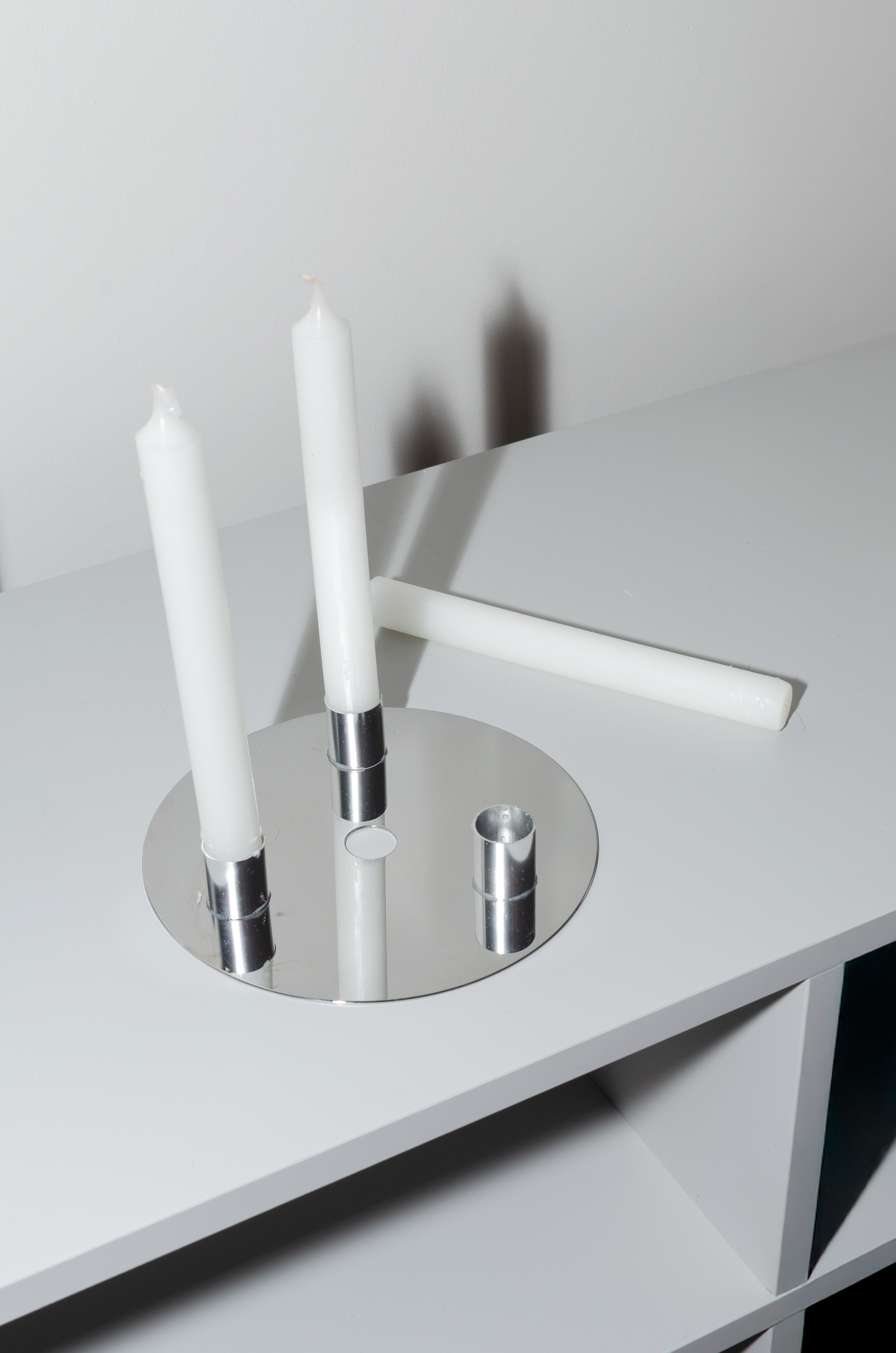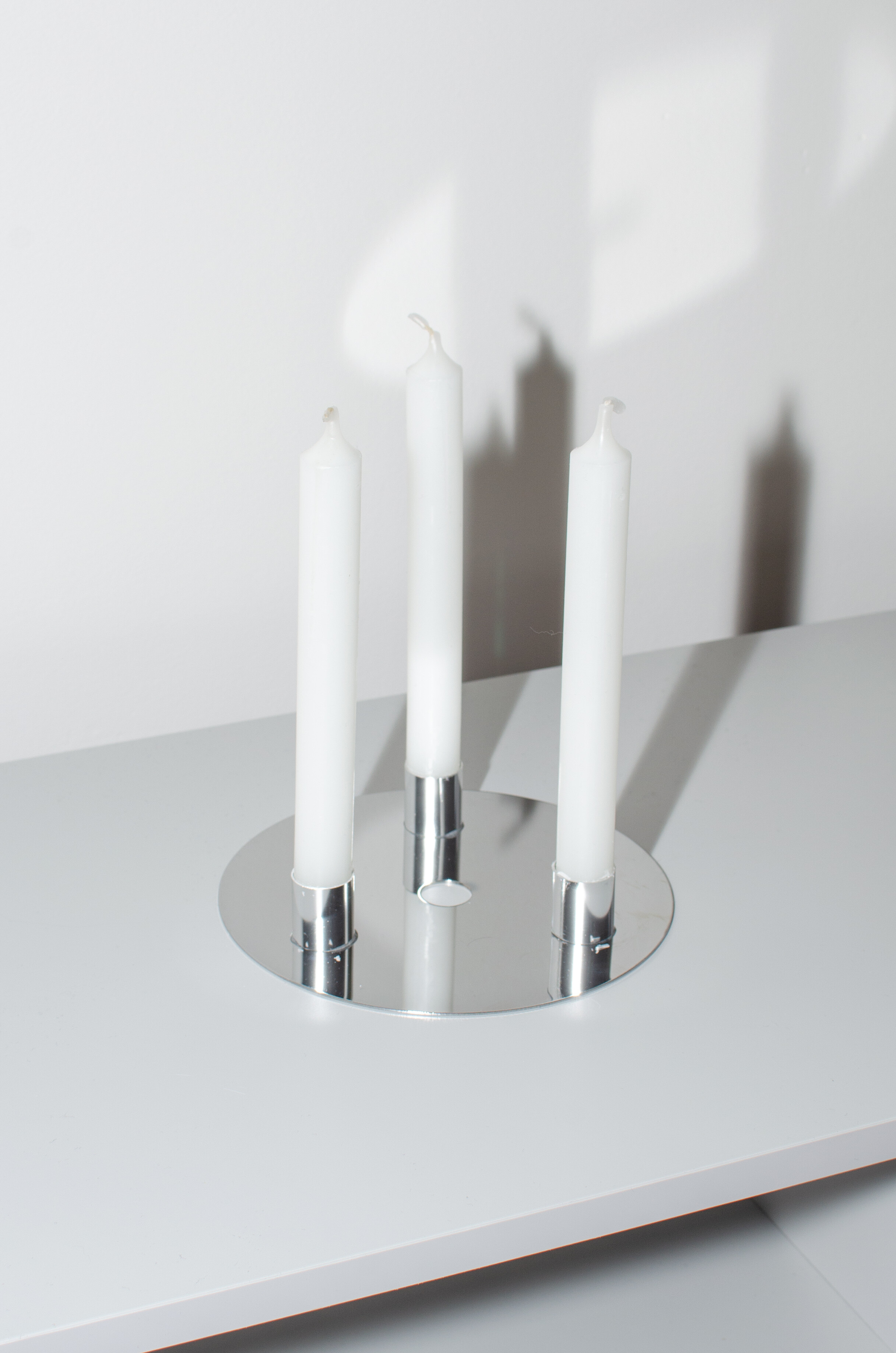 A reversible, three-armed candleholder made from repurposed chrome elements: a shower curtain rod and a ceiling lamp cover. The construction is based on a circular form with three holders for standard candles, highlighting the material qualities and industrial finish.