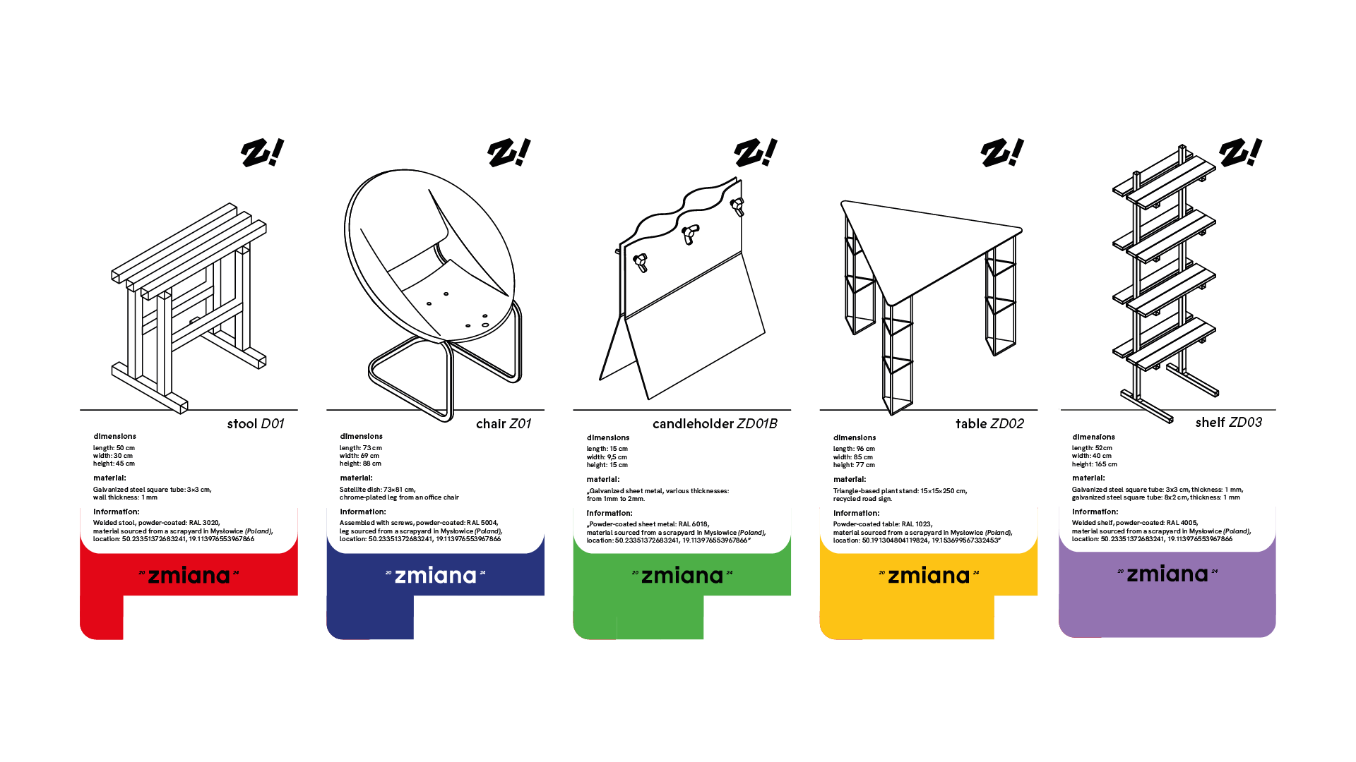 Zmiana” (“Change”) is a home furnishing set consisting of five pieces: a chair, a table, a stool, a shelf, and a candle holder in three variants. Each element is made from materials found in a scrapyard. By transforming these reclaimed materials into everyday items, it aligns with the idea of creative management of excess waste.